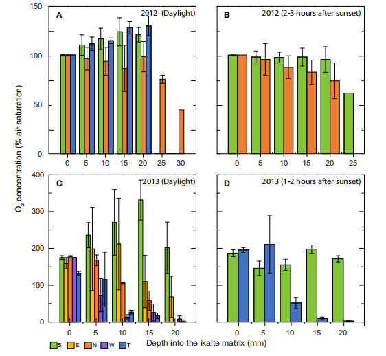 圖4、條形圖顯示測量伊卡石基質深度增加時的原位氧氣濃度剖面(以%空氣飽和度表示)。數據來自兩個野外實驗:(A,B)2012年和(C,D)2013年。圖表顯示白天測量(A,C)和日落后1-3小時的測量(B,D)。顏色表示在伊卡石鈣華柱上的測量位置;S=南,E=東,N=北,W=西,T=頂部。均值±標準誤(n=3-25);沒有誤差條的柱形圖n<3。復制品數量的廣泛跨度是由于各種因素(例如水流、寒冷暴露、疲勞)使得潛水員在某些方向上難以在較長時間內保持穩定。