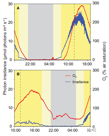 圖5、2013年野外實驗期間在伊卡石基質內部約15毫米處測得的光子輻照度(藍色)和氧氣濃度(紅色)的晝夜變化。在海平面平均7米深處的伊卡石鈣華柱頂部獲取。面板(A)是在晴朗天氣下獲得的,(B)是在完全陰天的情況下獲得的。虛線豎線表示中午(12:00),灰色區域表示夜間,淺黃色區域表示日出后和日落前的間接光,深黃色表示陽光從直接照亮峽灣的山脈中清晰照射的時間段。