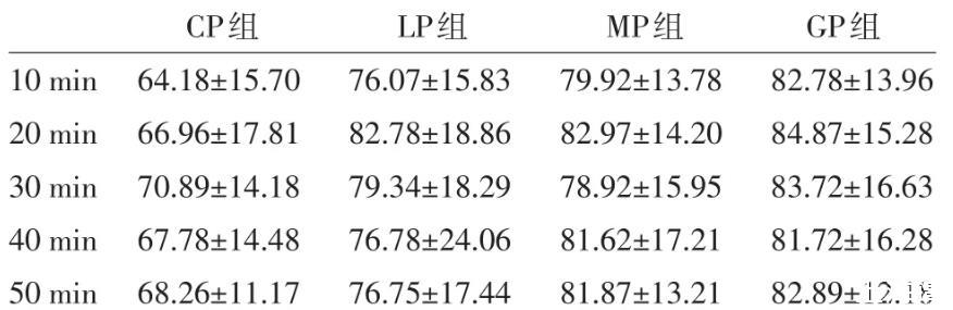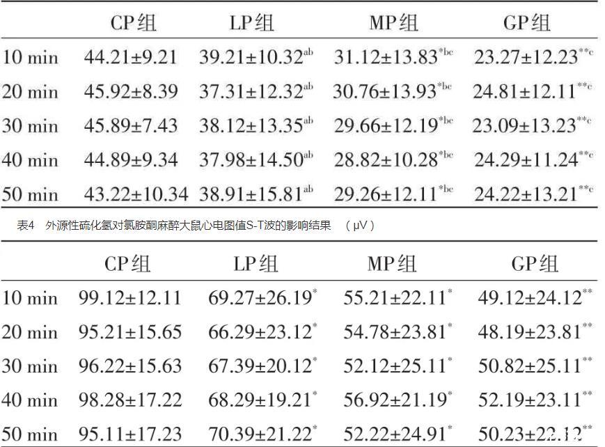 外源性硫化氫對(duì)氯胺酮麻醉大鼠心電的影響結(jié)果見表1、2、3、4、5,由表可知,與CP組相比較,不同劑量組P波Q波波幅在所有時(shí)間段內(nèi)差異性不顯著(P>0.05),劑量組間比較,差異性不顯著(P>0.05);R波波幅在10、20、30、40、50 min時(shí)間上差異性極顯著(P<0.01),但不同劑量組之間比較差異性不顯著(P>0.05);S-T波值在MP組差異性顯著(P<0.05),而且在GP組差異性極顯著(P< 0.01),LP組差異性不顯著(P>0.05);與CP組比較,LP組、MP組T波值有顯著性差異(P<0.05),GP組有極顯著差異(P<0.01),各濃度組間比較差異性不顯著(P>0.05)。