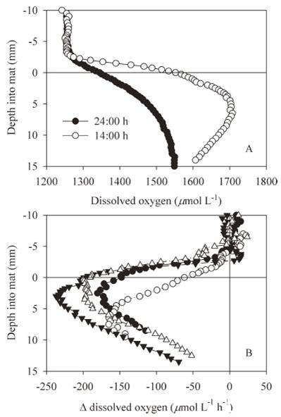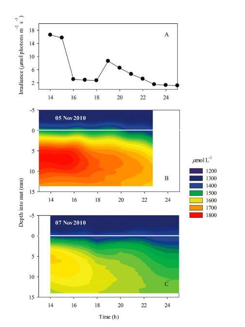 (A)Hoare湖近中午至午夜兩個時間序列中微生物墊中溶解氧濃度(mmolL-1)的輻照度(B,C)等值線圖。微生物藻墊-水界面處用白線表示