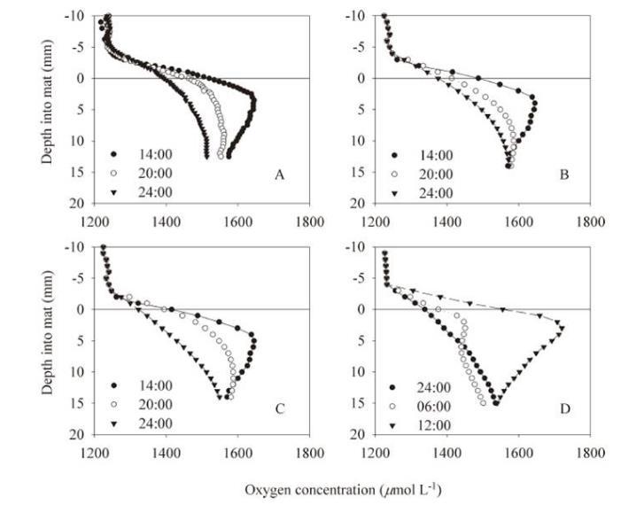 Hoare湖10米高氧動力學模擬。(A)6h觀測數據。(B)模擬擴散對起始剖面的影響。(C)完整模式,包括呼吸和光合作用。(D)利用環境輻照度數據,模擬由午夜觀測值所得的氧氣分布圖。可以看到面板之間12:00 h曲線的細微差異,因為觀測是在0.25 mm深度增量時進行的,而模型是在1 mm增量時運行的。