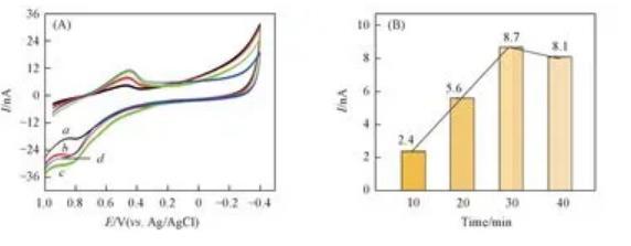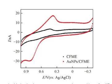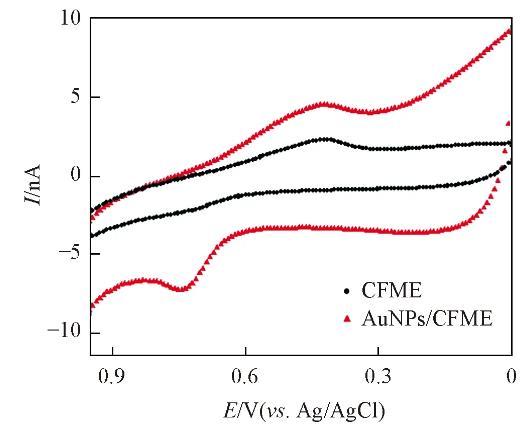 式中:A(cm2)為工作電極的有效電活性表面積;n為反應(yīng)中的電子轉(zhuǎn)移,該值等于2;D為在確定的溶液中指探針分子的擴(kuò)散系數(shù),約為9.145×10-7cm2/s;υ(V/s)表示掃描速率,c(mol/L)對(duì)應(yīng)于氧化還原探針的濃度,在該反應(yīng)中檢測(cè)到的分子濃度為10μmol/L;Ip(nA)代表氧化還原電流峰值。由Ip對(duì)v1/2線性方程[圖9(B)]的斜率計(jì)算得出CFME和AuNPs/CFME的表面積分別為4.123×10-7和5.498×10-6cm2,AuNPs/CFME的微觀電活性面積是裸CFME的13.334倍。上述結(jié)果表明,與CFME相比,AuNPs/CFME具有更大的比表面積,從而可提供更多的電化學(xué)活性位點(diǎn)。綜上,AuNPs/CFME電化學(xué)性能提高是修飾電極大的比表面積、優(yōu)良電導(dǎo)率以及AuNPs粒子的催化活性共同作用的結(jié)果。