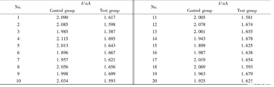 分別設(shè)置對(duì)照組和實(shí)驗(yàn)組,對(duì)照組為正常光照環(huán)境下的蘆薈植株,實(shí)驗(yàn)組為在黑暗環(huán)境下放置2 d的蘆薈植株(與對(duì)照組所用植株相同)。將納米金修飾后的CFME與參比電極插入蘆薈葉片的儲(chǔ)水凝膠組織中,進(jìn)行電化學(xué)檢測(cè),在不同葉片位置平行檢測(cè)20次,表1列出了測(cè)定結(jié)果。圖11為對(duì)照組和實(shí)驗(yàn)組分別進(jìn)行20次電化學(xué)響應(yīng)實(shí)驗(yàn)的柱狀圖,可以看出對(duì)照組的電化學(xué)響應(yīng)均明顯高于實(shí)驗(yàn)組(P<0.01),對(duì)照組和實(shí)驗(yàn)組的氧化峰電流值具有統(tǒng)計(jì)學(xué)差異,說明無光條件下蘆薈多糖的含量比正常光照環(huán)境下明顯降低,可用于衡量蘆薈植株光合作用程度。