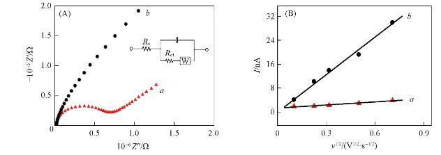 采用電化學(xué)阻抗譜(EIS)對(duì)修飾過程中電極的阻抗值變化進(jìn)行了考察。在EIS譜測(cè)定過程中,以[Fe(CN)6]3-/[Fe(CN)6]4-作氧化還原探針,阻抗譜半圓直徑等于電子轉(zhuǎn)移電阻Ret.結(jié)果如圖9(A)所示,譜線a和b分別為CFME和AuNPs/CFME的EIS譜線,頻率范圍0.05 Hz——100 kHz.裸CFME的Ret值非常大,約為5.913×105Ω,而AuNPs/CFME的Ret值明顯減小,約為10-3Ω.這是由于納米金粒子的表面效應(yīng)及表面原子的空位效應(yīng)使納米金粒子具有高活性,修飾電極表面被一層納米金粒子覆蓋,降低了電極的界面阻抗值。電極的電活性區(qū)域是評(píng)估電極性能的重要參數(shù),以多巴胺為氧化還原探針通過循環(huán)伏安法測(cè)定了修飾電極的有效表面積。對(duì)于可逆過程,采用Randles-Sevcik方程計(jì)算電極的電活性面積: