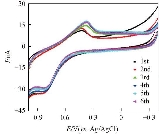 將AuNPs/CFME電極應(yīng)用于蘆薈植株在體檢測(cè),由圖7可見,CFME經(jīng)納米金修飾后在蘆薈儲(chǔ)水凝膠組織中檢測(cè)蘆薈多糖的電化學(xué)穩(wěn)定性明顯增強(qiáng),通過比較6次循環(huán)伏安掃描曲線中氧化峰和還原峰電流的變化得出其相對(duì)標(biāo)準(zhǔn)偏差(RSD)值<10%.這說明CFME經(jīng)納米金修飾后,降低了電化學(xué)動(dòng)態(tài)監(jiān)測(cè)蘆薈多糖水平的干擾。