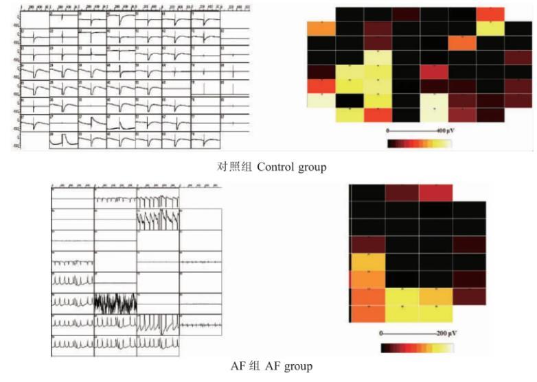 從左下至右、至右上的同步記錄心電信號中記錄到波形變化明顯的心耳肌組織塊早、中和晚的場電位信號,表明了電激動的傳導順序??梢妼φ战MLAA的電激動傳導大致從左下角向右向上緩慢而遞減傳導,電壓逐漸減小,呈梯度改變。48 h AF組LAA電激動的場電位原始圖,可見激動頻率明顯增加并紊亂,節律絕對不齊,場電位信號在傳導過程中,電壓發生明顯的改變,電壓梯度樣改變消失,呈高低不等改變,表明電激動傳導方向不一致,電壓互相抵消導致電壓梯度樣改變消失(圖6,彩插5)。