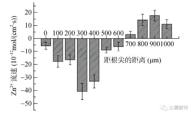在對Zn2+微電極進行一系列優(yōu)化和表征后,通過搭載非損傷微測系統(tǒng)對Zn/Cd超積累植物伴礦景天幼苗根際不同微區(qū)Zn2+離子流進行了測定。如圖4所示,伴礦景天在距離根尖600μm內(nèi)Zn2+凈通量為內(nèi)吸,且在300μm處有最強的吸收速率,在700~1 000μm處則有明顯的Zn2+外排信號。伴礦景天作為一種Cd/Zn超積累植物,其對高濃度的重金屬表現(xiàn)出一定的抗性和耐受性。通過非損傷微測技術(shù)發(fā)現(xiàn)其在根尖微區(qū)存在外排Zn2+的部位,這可能是其避免高濃度重金屬對其根部造成損害的一種主動防御措施,但是這種植物主動外排金屬離子的分子生物學(xué)過程機制目前尚不完全清楚,值得深入分析和研究。