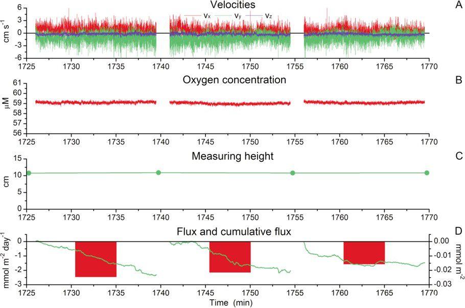 圖2、三個連續(xù)的13.5分鐘爆發(fā)的渦旋相關數(shù)據(jù)。(A)原始8赫茲速度數(shù)據(jù)(x、y、z)。可見的高頻噪聲源于底部水域中的低粒子濃度。(B)原始8赫茲O2濃度數(shù)據(jù)。(C)ADV記錄的每個爆發(fā)開始和結(jié)束時沉積物表面上方的速度和O2濃度的測量高度。(D)每個爆發(fā)的推導O2通量(柱形)和相關的累積通量(線)。