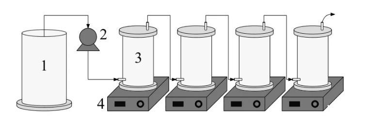 本實(shí)驗(yàn)采用有機(jī)玻璃制作的反應(yīng)器模擬下水道.裝置示意如圖1所示,4個(gè)密封的反應(yīng)器串聯(lián)排列,反應(yīng)器高150mm,內(nèi)徑80mm,內(nèi)壁貼有PVC薄片作為生物膜生長(zhǎng)的載體,下部放置磁力攪拌器攪拌模擬水流沖刷剪切力,磁力攪拌器轉(zhuǎn)速與剪切力的關(guān)系為:
