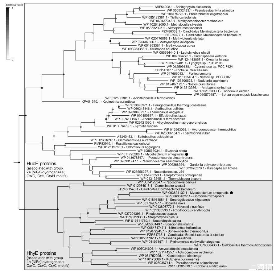 圖1、與2a組和1h[NiFe]-氫化酶相關的HucE和HhyE蛋白的系統發育樹。該樹可視化了52個全長HucE和26個全長HhyE序列的代表性子集之間的進化關系。強調了恥垢分枝桿菌編碼的蛋白質。該樹是使用最大似然法(用部分刪除處理間隙)構建的,用100個重復進行引導,并在中點扎根。