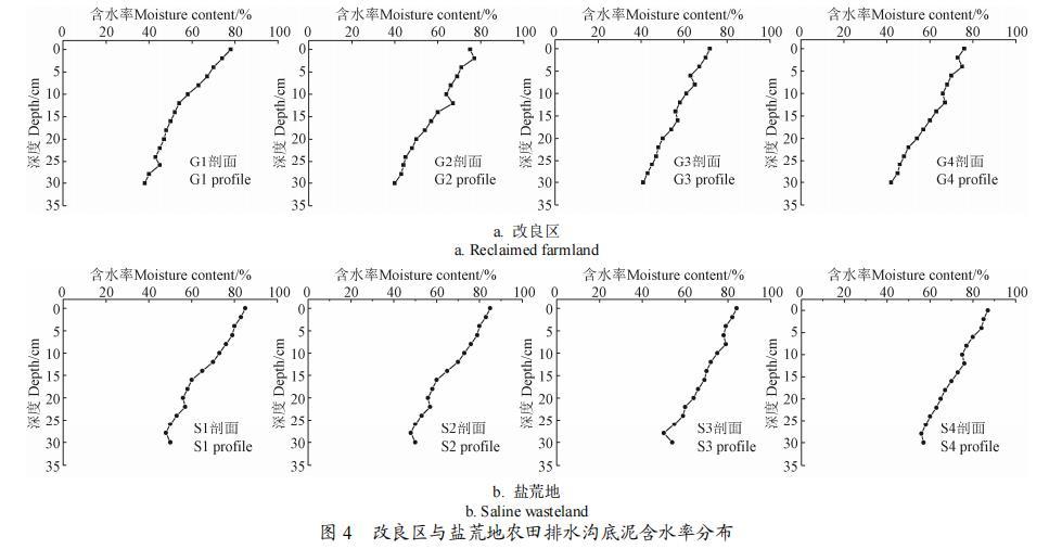 2)改良區與鹽荒地排水溝底泥表層10 cm范圍內含水率分別為54%~78%和73%~87%,含水率分布呈現出隨深度增加逐漸減小的總趨勢。