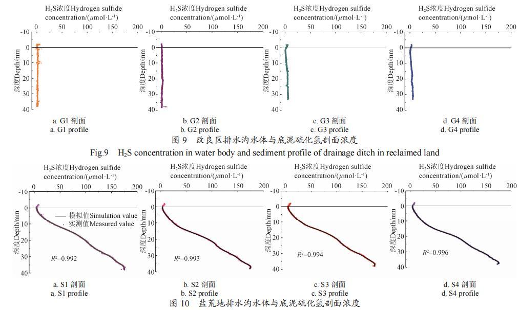 由H2S微電極測得8個監測點水體與底泥H2S剖面濃度分布如圖9、圖10所示,圖中深度為0表示水體與底泥界面,垂直向下即為底泥深度。由圖可知,改良區排水溝監測剖面H2S濃度在垂向上的含量均很低(<10μmol/L);鹽荒地排水溝監測剖面H2S濃度在垂向上呈現出隨深度先增加后降低的總趨勢,峰值出現深度在界面以下約40 mm處,最高濃度可達178μmol/L。應用Profile模型對鹽荒地排水溝監測剖面H2S濃度在垂向上的分布進行模擬,圖10顯示模擬值與實測值吻合度較高,表明該模型也能客觀地描述H2S在底泥中的分布。鹽荒地排水溝底泥氧氣的最大滲透深度僅為2.6 mm(圖7),低DO滲透深度更有利于底泥內源磷釋放,進而造成上覆水體中磷的積累并影響排水溝生態功能。采集的底泥樣品感官表現出發黑發臭,依據底泥硫酸根含量(表1)和已有研究結果,初步推斷鹽荒地排水溝底泥中的H2S可能是SRB利用硫酸根作為電子受體進行無氧呼吸作用產生,尚需進一步深入研究。