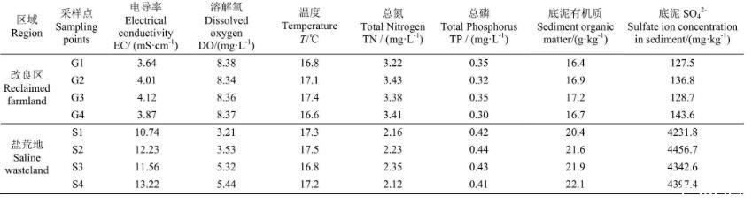 研究區農田排水溝監測點水體水質和底泥指標含量如表1所示。監測結果顯示:改良區排水溝水體EC值基本穩定在3.64~4.12 mS/cm,鹽荒地排水溝水體EC值在10.74~13.22 mS/cm之間波動,表明鹽荒地排水溝內鹽分有一定的累積;改良區排水溝水體DO值基本穩定在8 mg/L,鹽荒地排水溝水體DO值在3.21~5.44 mg/L之間變化,且水體有異常氣味;改良區排水溝水體TN含量在3.22~3.43 mg/L、TP含量在0.30~0.35 mg/L、底泥有機質含量在16.4~17.2 g/kg、硫酸鹽含量在127.5~143.6 mg/kg,鹽荒地排水溝水體TN含量在2.12~2.35 mg/L、TP含量在0.41~0.44 mg/L、底泥有機質含量在20.4~22.1 g/kg硫酸鹽含量在4231.8~4456.7 mg/kg,均存在不同程度的差異。