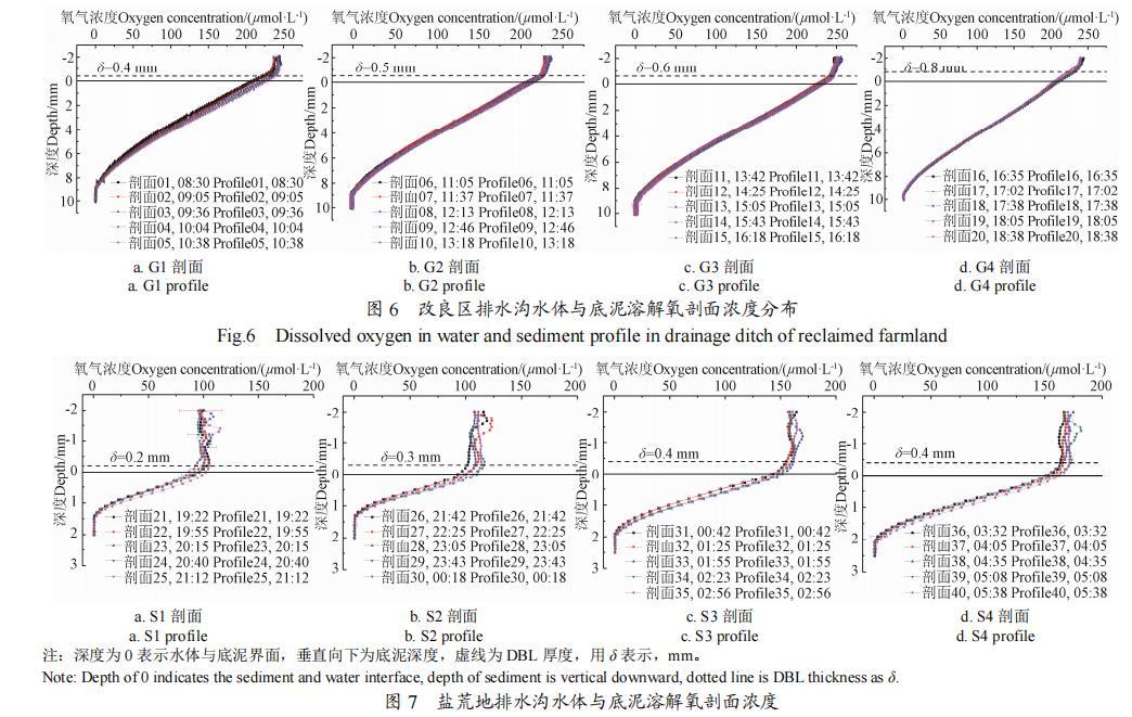 3)改良區排水溝底泥DO的滲透深度可達10.2 mm,擴散邊界層厚度為0.4~0.8mm;鹽荒地排水溝底泥DO的滲透深度最大為2.6 mm,擴散邊界層厚度為0.2~0.4 mm。