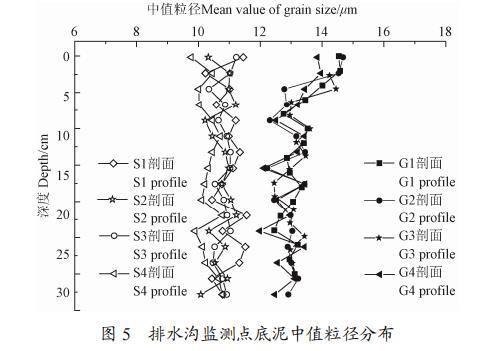 圖5顯示8個監測點底泥剖面中值粒徑垂向分布,由圖可知,改良區排水溝底泥G1-G4剖面中值粒徑在12~15μm之間,隨著深度的增加而減小,底泥0~10 cm內的中值粒徑明顯大于下層,下層中值粒徑呈現鋸齒狀變化;鹽荒地排水溝底泥S1~S4剖面中值粒徑在9~11μm之間變化。改良區與鹽荒地2種水力條件差異較大的排水溝底泥中值粒徑不同,體現出一定的空間異質性特征。