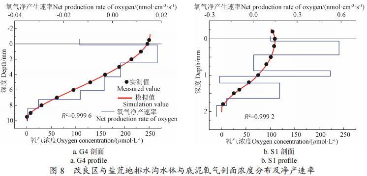 根據實測的DO剖面濃度分布,結合Profile模型假定在恒定狀態下忽略生物擾動和沖洗作用,剖面的上邊界條件為擴散邊界層最上面一點的DO濃度值,下邊界為底泥含氧區與無氧區的交界值設為0,消除偶然因素計算DO擴散通量,計算結果經F檢驗后輸出,經過比對選取改良區G4剖面和鹽荒地S1剖面進行分析,將模擬和實測的DO剖面濃度繪制于圖8。由圖可知二者吻合度較高,表明該模型能客觀地描述DO在界面擴散邊界層和底泥中的分布。改良區水體與底泥界面附近凈產氧速率為0.018 nmol/(cm3·s),之后轉變為凈耗氧,直至氧氣耗散殆盡,凈產氧和凈耗氧速率量級均較小,鹽荒地水體與底泥界面附近最大凈產氧速率達到了0.58 nmol/(cm3·s),約為改良區的32倍,相比較而言,鹽荒地排水溝底泥有機質含量較高、環境功能微生物活性較強,凈產氧和凈耗氧交替進行。總體來看,2種水力條件差異較大的排水溝底泥含氧層DO剖面變化梯度存在差異,DO濃度曲線的平滑程度表明二者的耗氧機制也有所不同。