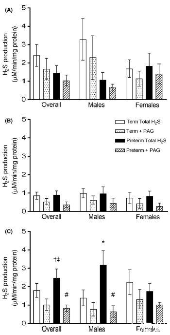 圖4、收集自胎兒(圖A;足月雄性,n=4;足月雌性,n=3;早產(chǎn)雄性,n=4;早產(chǎn)雌性,n=4)和產(chǎn)后24小時的新生兒(圖B;足月雄性,n=4;足月雌性,n=3;早產(chǎn)雄性,n=3;早產(chǎn)雌性,n=4)的心臟能夠產(chǎn)生硫化氫,當提供過量的底物和輔因子時。添加丙炔氨酸(PAG)表明,在產(chǎn)后心臟中,總硫化氫的一個顯著比例是通過依賴CSE的機制產(chǎn)生的。*P<0.05與同一性別的相應足月組比較,?P<0.05與胎兒時間點內的相應胎齡組比較,#P=0.05與相應的總硫化氫產(chǎn)生值比較。
