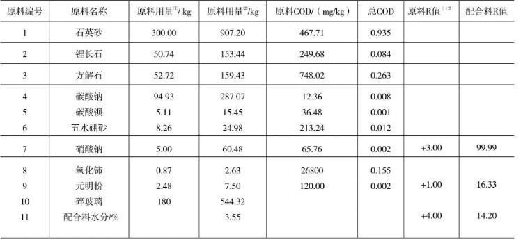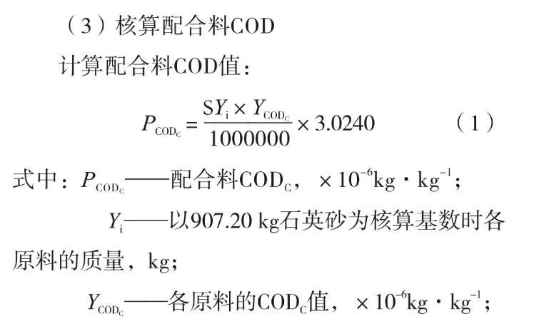 配合料COD是Redox值的核算基礎(chǔ),與配合料中的還原劑有著等效的作用影響著配合料還原勢(shì),因此在進(jìn)行Redox值核算前需先對(duì)COD進(jìn)行計(jì)算。