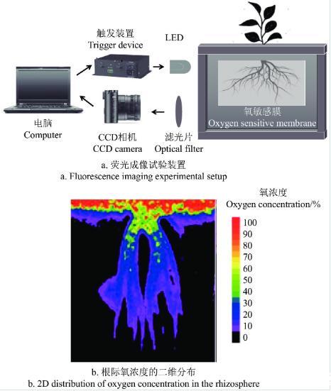 熒光成像是一種用于可視化生物分子和生物過程的非侵入性成像技術。熒光成像的裝置如圖3a所示,將熒光染料或標記物與要研究的生物分子或細胞結合,然后用激發光激發染料或標記物,使其發出熒光信號。熒光信號可以被記錄并轉換為圖像,如圖3b所示,從而可視化生物過程。利用這種方法需要將熒光染料注入到根系周圍的土壤中,待熒光染料擴散到根系表面后,使用熒光顯微鏡或熒光成像儀來檢測熒光強度分布情況,從而推斷根系周圍氧氣分布的情況。利用熒光原位成像的方法獲取土壤根際中氧氣濃度的實時分布,可以了解根系呼吸,以及土壤對根系呼吸的響應。LARSEN等提出了一種簡單、廉價、高分辨率的彩色比色平面光電極成像方法,可以實時監測植物根系周圍的氧濃度和pH值。該方法在光電極上使用2種敏感熒光探針,用于測量土壤pH值和氧濃度。這2種探針的熒光強度隨pH值和氧濃度的變化而變化,而探針熒光顏色保持不變。比較2種探針的熒光強度,可以計算出pH值和氧濃度的值,并且可以通過使用彩色相機將其成像,以獲得高分辨率的空間分布圖像。該方法不僅簡單易用,而且具有高靈敏度和高分辨率,可以在水體中進行原位測量,相對于傳統分析方法更加經濟、便捷和準確。