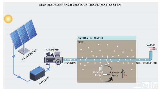 圖1、人造通氣組織(MAT)系統(tǒng)示意圖。該圖說明了將空氣泵入MAT中使用的硅膠管的過程。垂直土壤剖面說明了MAT的潛在工作機制。