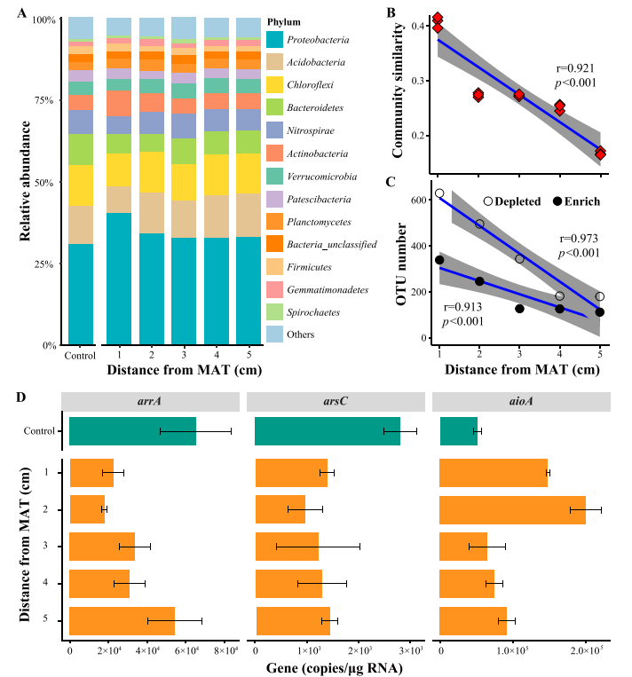 圖5、微生物群落組成和As代謝基因豐度的變化。(A)微生物群落在對照中的分布以及與MAT表面不同距離處的分布;(B)距MAT表面不同距離處的群落相似性;(C)在距MAT表面不同距離處OTU數(shù)量顯著變化;(D)作為對照的代謝基因,與MAT表面相距不同的距離。