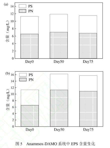 圖5 Anammox-DAMO系統(tǒng)中EPS含量變化