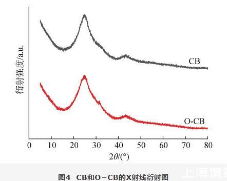 XRD結果表明O?CB與CB均在25°和40°有明顯的衍射峰,分別對應石墨碳的(002)和(100)晶面。通過XRD譜上(002)峰的強度可以反映碳材料的石墨化程度,一般而言石墨化程度越高,碳材料的導電性和化學穩定性越好。因此,氧化處理不會破壞炭黑的結構,同時,保留了炭黑的高石墨化度的特點(圖4)。