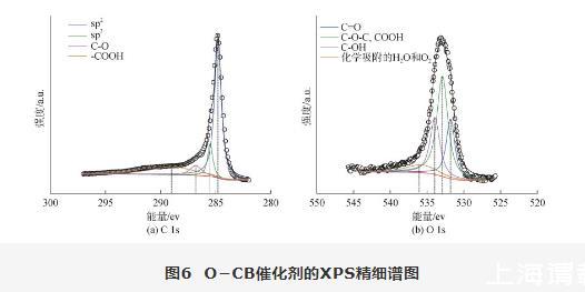 羧基,羰基,醚鍵等含氧官能團,被認為是氧摻雜碳材料的氧還原反應產生H2O2催化活性來源。通過XPS表征可以獲得表面元素的種類和價態信息。XPS結果表明,C 1s可以分為C=C鍵(284.8 eV),C?C鍵(285.5 eV),C?O鍵(286.8 eV),O=C?O鍵(289.0 eV)(圖6a)。O 1s可以擬合為531.8 eV、532.9 eV、534 eV、536 eV 4個峰,分別對應C=O鍵,C?O?C或COOH鍵,C?OH鍵,化學吸附氧(圖6b)。以上結果證明,通過硝酸氧化處理后,獲得的O?CB表面引入了多種氧官能團,其中的C?O?C鍵或?COOH含量最高。
