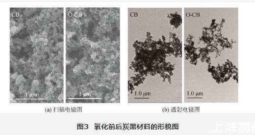 氧化前后炭黑的形貌通過SEM和TEM表征,通過結果可以看出樣品整體呈現典型的不規則的球形顆粒形貌。對比觀察氧化處理前后的炭黑樣品,發現氧化處理后,催化材料原有形貌沒有改變(圖3)。