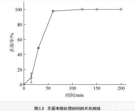 為了測試O?CB/PTFE-5 wt%電極實際的電催化殺菌消毒效果,我們選擇sp作為模式菌進行相關實驗。為防止電解液成分對細菌存活狀態的影響,我們選擇在中性pH的PBS電解液中進行測試。根據平板計數結果,計算得到相應電催化過程的殺菌率曲線,誤差棒代表3個平行培養平板間誤差(圖12)。從結果來看,O?CB/PTFE-5 wt%電極在電催化30 min內可以殺滅48.5%的細菌,60 min內即可滅殺97.69%的細菌,對sp.實現較強的抗菌作用,120 min內可殺滅99.99%以上的細菌。