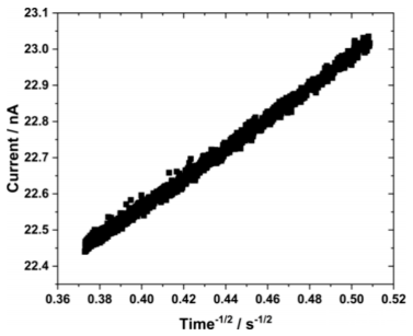 圖4。圖3所示時安培圖上高亮顯示的電流區域的線性化。(Current/nA)=4.14(time/s)?1/2+20.90;R2=0.9951。