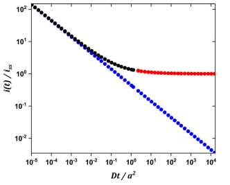 圖1。使用Cottrell方程(藍點)和Mahon和Oldham方程計算的短期(黑點)和長時間(紅點)的電流值。