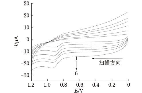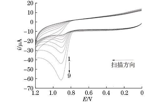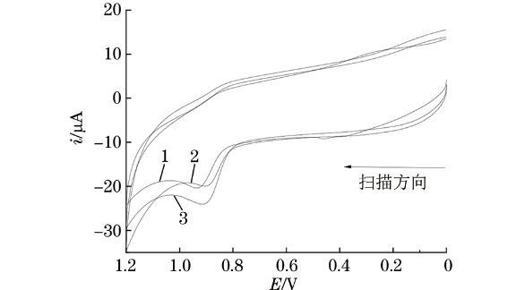 試驗考察了L-谷氨酸聚合圈數分別為2,4,6,8,10,12圈時對亞硝酸鈉氧化峰電流的影響。結果表明:隨著聚合圈數的增加,氧化峰電流先增大后減小;當聚合圈數為6圈時,氧化峰電流較大。因此,試驗選擇的聚合圈數為6圈。