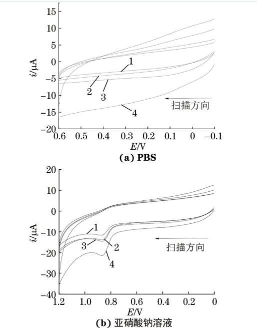 圖2不同電極在PBS和亞硝酸鈉溶液中的CV曲線