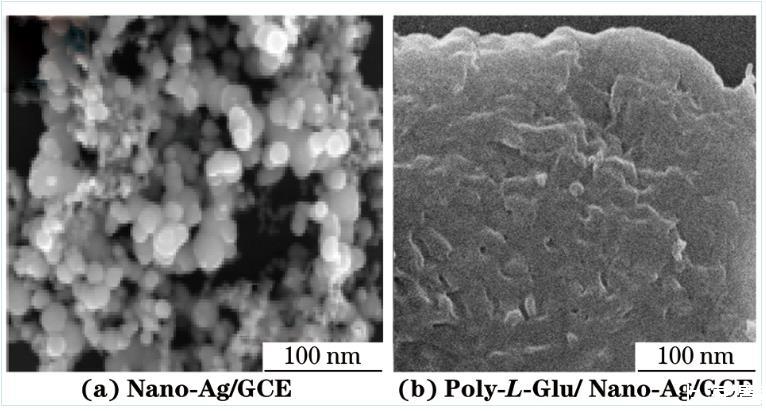 圖1 Nano-Ag/GCE和Poly-L-Glu/Nano-Ag/GCE的SEM圖