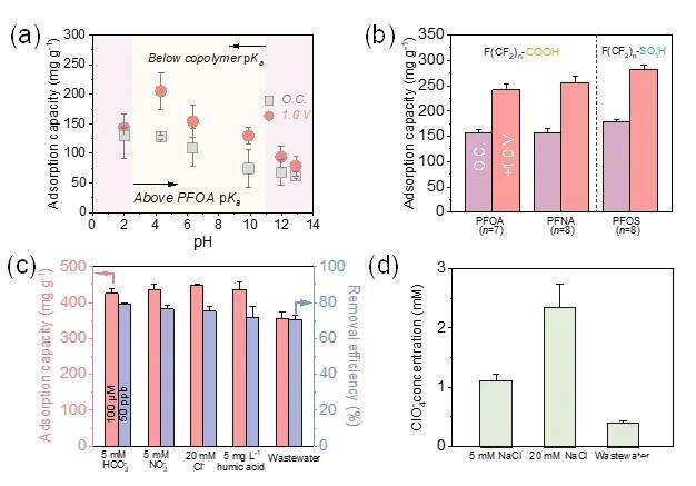 圖6:MWCNT-g-P(TMPMA-co-TMA)在不同條件下對PFOA的吸附容量。(a)在不同pH值條件下的PFOA吸附容量;(b)不同鏈長和頭基的PFAS的吸附容量;(c)在不同水質基質中PFOA的吸附和去除率;(d)氧化過程生成ClO??的情況。