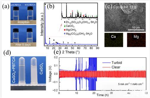 浸泡有鋅箔的ASW和ASW+PBTCA電解液在(a)初始和五天后的狀態(tài)以及(b)電解液中沉淀物的XRD分析;(c)循環(huán)后電極表面的SEM及元素分布;(d)PBTCA添加前后CaSO4溶液的狀態(tài);(e)渾濁電解液與澄清電解液組裝對(duì)稱(chēng)電池循環(huán)示意圖。