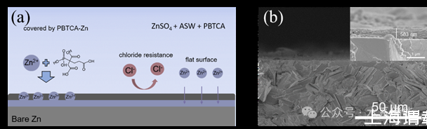 (a)PBTCA緩蝕機(jī)制示意圖以及(b)鋅片在添加PBTCA電解液中浸泡5天后的SEM截面示意圖。