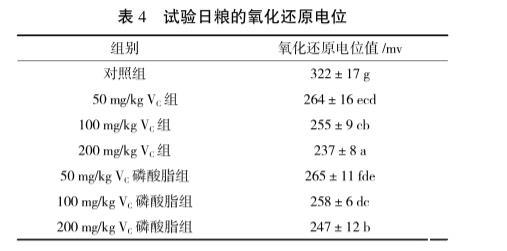 結果見表4。由表4可見,添加抗氧化劑后,飼料氧化還原電位有所變化,且與添加量有一定量效關系。說明,在飼料中添加抗氧化劑(VC和VC磷酸脂)可以降低飼料的氧化還原電位。