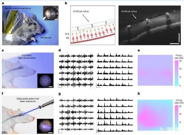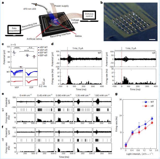 作者報道了一種柔軟的人造視網膜,由高分辨率、柔性光電晶體管陣列組成,具有直接打印的3D LM微電極,能夠進行微創視網膜刺激。體內實驗表明,可見光照明誘導了光線入射的局部視網膜區域的RGCs的尖峰活動,表明活rd1小鼠具有視力恢復的潛力。這些結果對不均勻視網膜變性患者的個性化人工視網膜的開發具有預后意義。