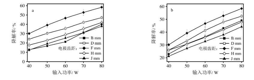 典型電極齒距與氨氣和硫化氫的降解效果的關(guān)系如圖4所示。實(shí)驗(yàn)條件:1)外施電壓為220 V;2)空氣流量為5 m3/h;3)電極間距為13 mm;4)電極高度為8 mm;5)氨氣濃度為340 mg/m3,硫化氫濃度為500 mg/m3;6)溫度為30℃,相對(duì)濕度為35%,考察電極齒距為3 mm、4 mm、5 mm、6 mm、7 mm時(shí)的氨氣和硫化氫降解效果關(guān)系。由圖4可知,在不同輸入功率情況下,氨氣和硫化氫的降解率先隨著電極齒距的增加而增大,當(dāng)電極齒距為5 mm時(shí)達(dá)到最大值,而后隨著電極齒距的進(jìn)一步增大而逐漸降低,得到電極齒距為5 mm時(shí)具有最大的氨氣和硫化氫降解率。可能的原因是當(dāng)電極齒距增加時(shí),電極的單針?lè)烹姽β屎头烹娔芰棵芏入S之增加,但當(dāng)電極齒距過(guò)大時(shí),兩者隨之降低。同時(shí)考慮電極齒距增大利于放電穩(wěn)定,所以確定最佳電極齒距為5 mm左右。