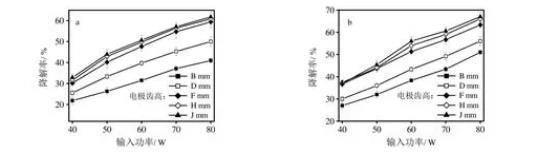 圖5電極齒高與氨氣(A)和硫化氫(B)降解率的關(guān)系