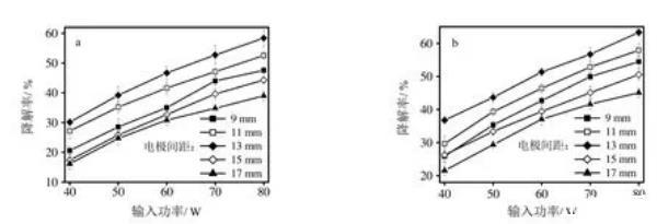 典型電極間距與氨氣和硫化氫的降解效果的關(guān)系如圖3所示。實(shí)驗(yàn)條件:1)外施電壓為220V;2)空氣流量為5 m3/h;3)電極齒距為6 mm;4)電極高度為8 mm;5)氨氣濃度為340 mg/m3,硫化氫濃度為500 mg/m3;6)溫度為30℃,相對(duì)濕度為35%,考察電極間距為9 mm、11 mm、13 mm、15 mm、17 mm時(shí)的氨氣和硫化氫降解效果關(guān)系。由圖3可知,在不同輸入功率情況下,氨氣和硫化氫的降解率先隨著電極間距的增加而增大,當(dāng)電極間距為13 mm時(shí)達(dá)到最大值,而后隨著電極間距的進(jìn)一步增大而逐漸降低,得到電極間距為13 mm時(shí)具有最大的氨氣和硫化氫降解率。可能的原因是當(dāng)電極間距增加時(shí),電極的單針?lè)烹姽β屎头烹娔芰棵芏入S之增加,但當(dāng)電極間距過(guò)大時(shí),兩者隨之降低。同時(shí)考慮電極間距增大利于放電穩(wěn)定,所以確定最佳電極間距為13 mm左右。