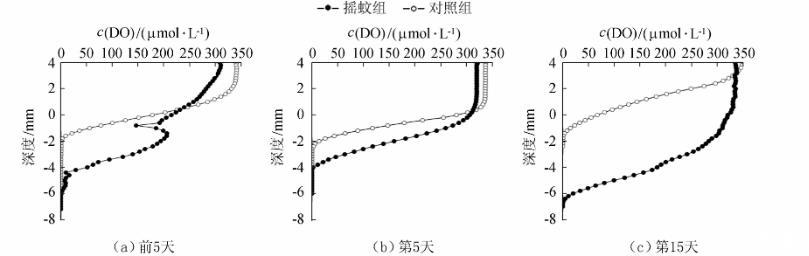 搖蚊組和對照組沉積物-水界面中DO的垂向剖面分布情況如圖1所示,正值代表是上覆水,負值代表沉積物,下同。通過分析前5天和第5天發(fā)現(xiàn),對照組和搖蚊組DO值無顯著性差異(P>0.05),搖蚊組在搖蚊幼蟲剛加入時,對原沉積物環(huán)境產(chǎn)生較大擾動,呈不規(guī)則的波狀變化,對照組DO值隨時間變化不大;到了第15天,對照組和搖蚊組-3.3 mm以下DO值成顯著性差異(P<0.05)。