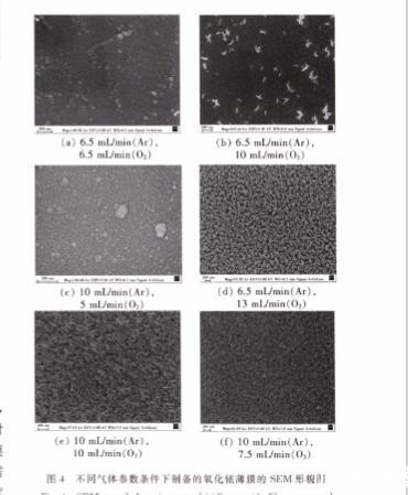 由于雙模微電極陣列的電極點的尺寸非常小,需要進行圖形化,并且后續需要進行其他工藝,對薄膜的質量和穩定性有較高的要求。本文中的雙模微電極陣列需要對氧化銥薄膜進行圖形化,因此需要剝離工藝結合濺射工藝進行,由于光刻膠在溫度過高時,會過熱變性,導致無法剝離,因此需要控制氧化銥薄膜濺射時的溫度不能過高。一般來說氣壓越低,濺射時腔內的溫度就會越高,但是濺射氣壓較高又會導致薄膜的黏附性較差容易脫落,因此要平衡二者,在保證不會導致光刻膠變性的前提下使濺射時的氣壓越低越好。所以探究了在不同氧氣和氬氣流量下濺射出的氧化銥薄膜的微觀結構的差別,之后確定了能夠成功滅射并且完成剝離工藝的溯射參數。參考X.Y.K ang等人[n]的工作,本文分別采用6組氣氛參數進行濺射實驗,之后對其采用掃描電子顯微鏡(SEM)進行測試,其微觀結果如圖4所示。從圖4可以看到,銥在總體積流量低于16.5 mL/m in時,幾乎無法形成褶皺形狀的氧化銥薄膜,原因可能是氣壓壓強過低,銥無法被持續性氧化形成氧化銥薄膜層。在10 mL/m in氬氣和10 mL/m in氧氣體積流量條件下得到了褶皺形狀的氧化銥,該薄膜褶皺較大,大大增加了氧化銥薄膜的表面積,同時其分布較為致密,因此選擇該參數作為制備氧化銥薄膜的溯射參數。之后在硅片上進行剝離實驗,觀察該參數是否可以成功將氧化銥薄膜圖形化。剝離后的氧化銥薄膜在丙酮中會起皺,從而大面積脫落,這是由于薄膜的黏附性較差,因此需要進一步改善工藝。本文采取增加黏附層的方法來改善上述問題,在濺射氧化銥薄膜之前,先在10 mL/m in氬氣的條件下濺射1 m in的銥金屬層作為黏附層,再采用上述參數溯射氧化銥薄膜,之后進行剝離實驗。最終效果如圖5所示,可以看到氧化銥薄膜成功進行了圖形化,并且完全沒有出現起皺的現象,其黏附性非常出色。
