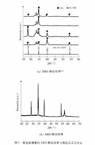 其主要元素分布如圖8所示,可以看到I r元素和〇元素的分布非常均勻致密,反映出氧化銥薄膜分布得非常均勻,有利于對p H的響應。之后進行X射線衍射(X R D)測試,將測試結果與理論結果D2]進行對比,如圖9所示,圖中2 0為衍射角。圖9(b)的X R D圖譜顯示在2 8°、3 5°、40°和5 4°附近都有明顯的衍射峰,根據圖9(a)中的標準卡片43-1 0 1 9可知,這4個衍射峰分別對應Ir()2晶體的(1 1 0)、(1 0 1)、(2 0 0)和(221)晶面。從結果可以得出該氧化銥薄膜的主要成分為Ir〇2,證明成功制備了氧化銥薄膜。