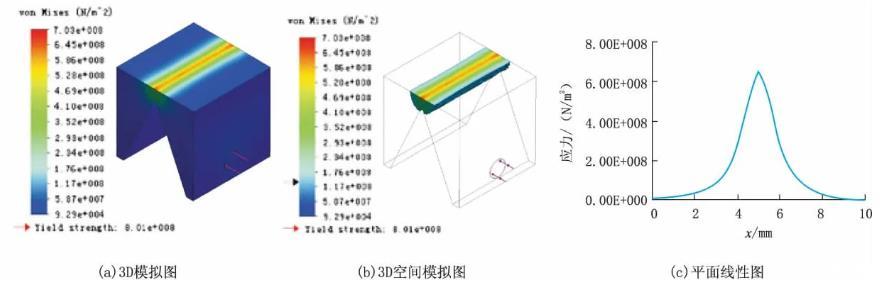 圖2所示為試樣在施加1 000 N外力作用下的應(yīng)力分布模擬圖,其中包括3D圖和線形圖。從圖2可以看到,試樣缺口處的應(yīng)力值最大,為6.4×108N/m2(約640 MPa),隨著離缺口距離越來越遠(yuǎn),應(yīng)力值快速下降。