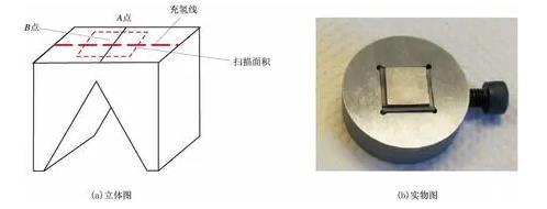 試樣如圖1所示,尺寸為10 cm×10 cm×10 cm,并開一個(gè)49°V形槽,通過螺栓負(fù)荷裝置對試樣施加1 000 N的力(圖1(b))。為了避免試樣和螺栓裝置的直接接觸,在試樣和螺栓裝置中間的間隙內(nèi)安裝四根聚甲基丙烯酸酯絕緣桿。試樣的工作面依次用1000#金剛石砂紙磨平,然后用金剛石研磨膏拋光至1~3μm。