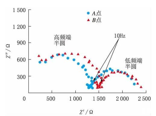 圖3所示是在NS4溶液中試樣表面A點(diǎn)和B點(diǎn)(如圖1所示)的LEIS點(diǎn)測量圖。從圖3可以發(fā)現(xiàn),兩點(diǎn)的測量圖譜具有相同的特征,都是在整個(gè)頻率范圍內(nèi)有兩個(gè)半圓弧組成;所不同的是,B點(diǎn)在高頻端半圓弧較A點(diǎn)明顯一些,然而在低頻端半圓弧卻是基本相同。因?yàn)樽杩箞D譜包含兩個(gè)半圓弧,因此普遍認(rèn)為高頻端半圓弧與腐蝕產(chǎn)物層或氧化膜有關(guān),而低頻端半圓弧與界面的電子轉(zhuǎn)移反應(yīng)有直接聯(lián)系。一個(gè)大尺寸的半圓弧意味著一個(gè)高的膜阻抗或電荷轉(zhuǎn)移阻抗。因此,隨著半圓弧尺寸的增加,腐蝕阻抗隨之增加。