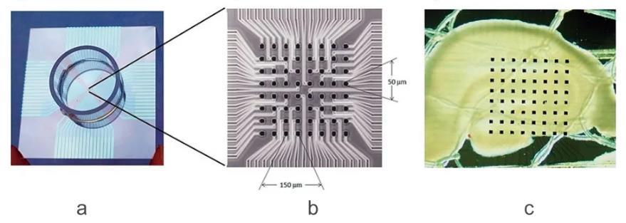 圖1.MED64平面微電極陣列探針(a.MED64Probe;b.8×8等距微電極陣列;c.海馬腦片在電極陣列上的位置)